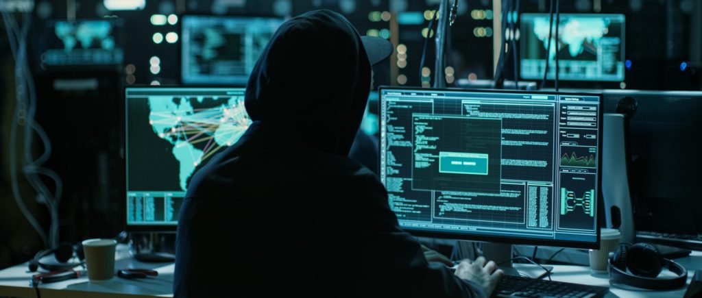 #paraCegoVer : Hacker opera computador, diversos monitores.